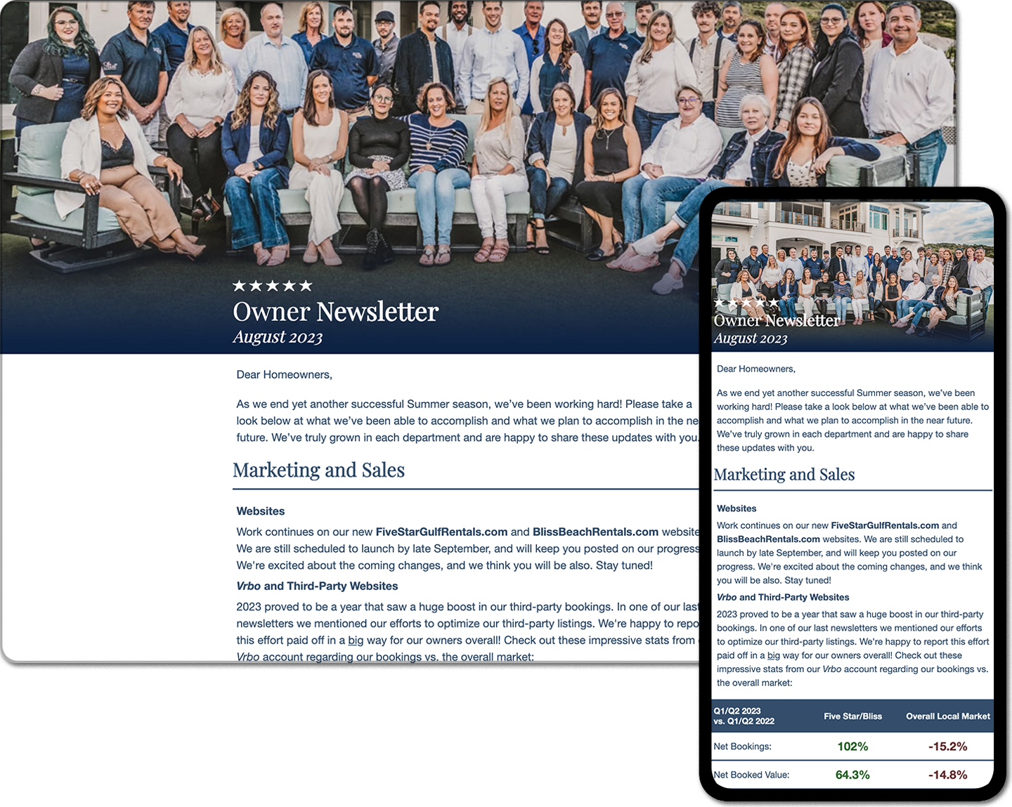 Weekly promotional and informative emails sent to Five Star Properties' marketing list which was segmented by any acquired lead data (past stays, inquiry parameters, pets, number of guests, etc.)